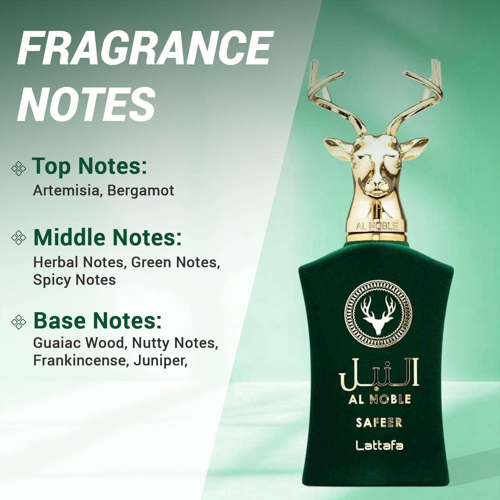 Al Noble Safeer is a refined and uplifting unisex fragrance that embodies freshness with a woody-spicy twist. It opens with bright citrus notes of bergamot and lemon, offering a clean and energizing start. The heart introduces warm nutmeg and aromatic clary sage blended with crisp juniper berries, creating an elegant balance between spice and herbaceous tones. The dry down of cypress and tonka bean gives a smooth, creamy finish with a comforting woody depth. Perfect for daily wear, office use, or casual evenings.