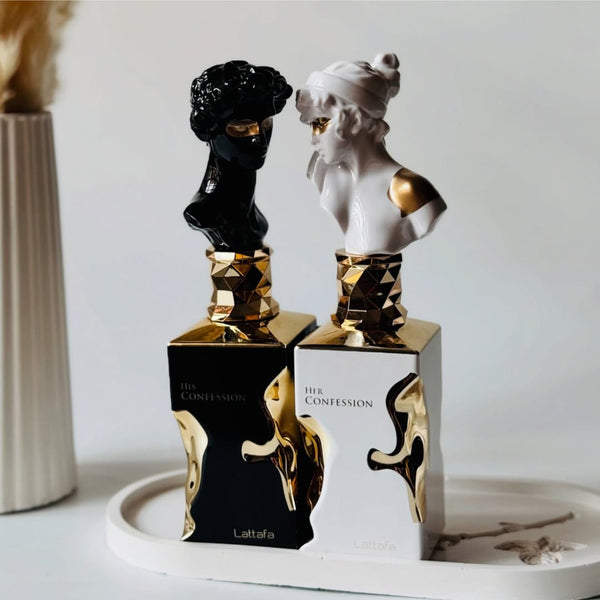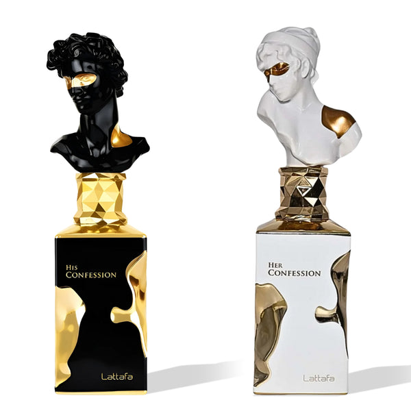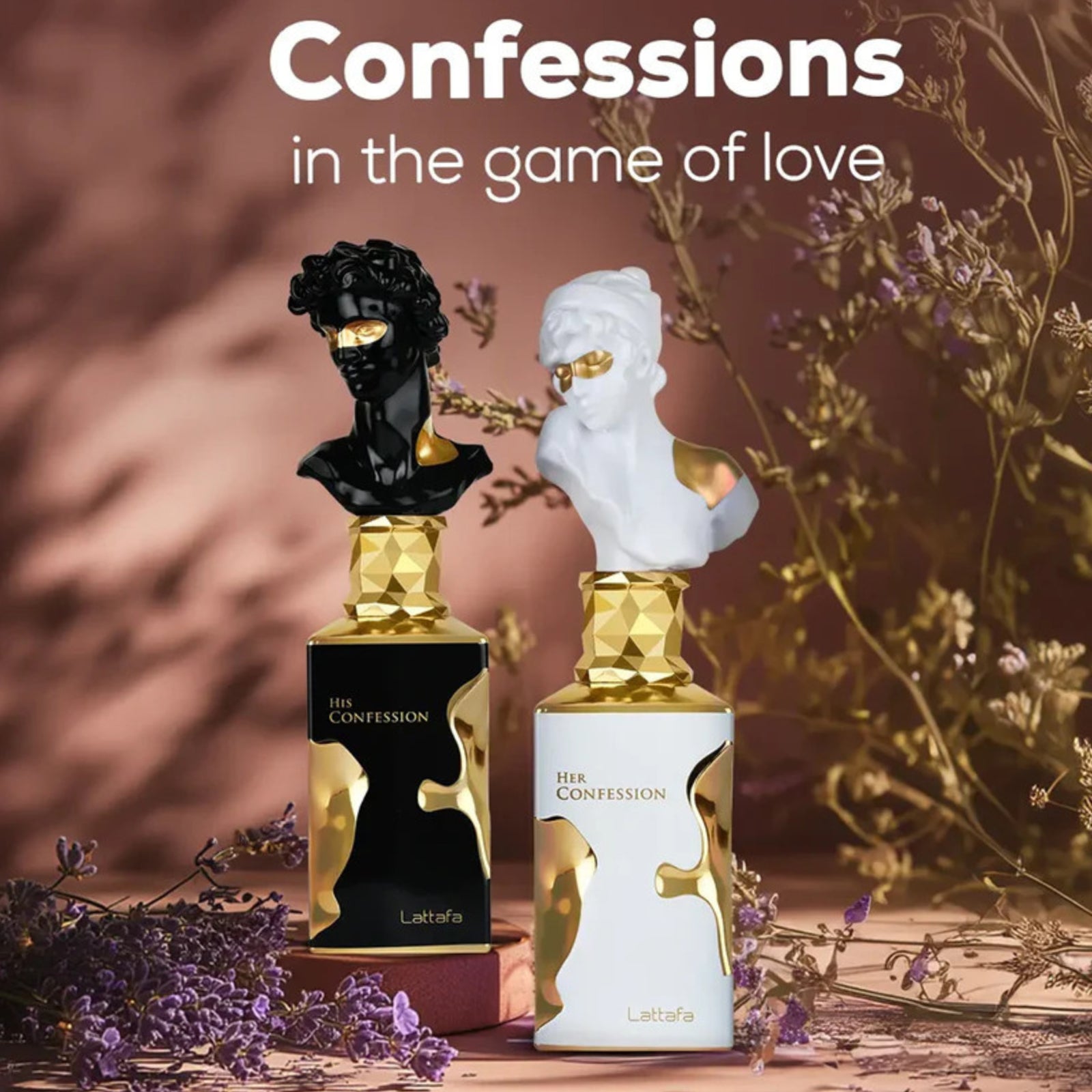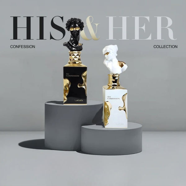 His & Her Confession by Lattafa is a luxurious dual fragrance set crafted for couples who embody confidence, charisma, and style. His Confession exudes strength with its spicy, woody, and aromatic layers, while Her Confession captures elegance through its sweet, floral, and musky accords. Together, they form a perfect harmony — bold yet sensual, modern yet timeless.