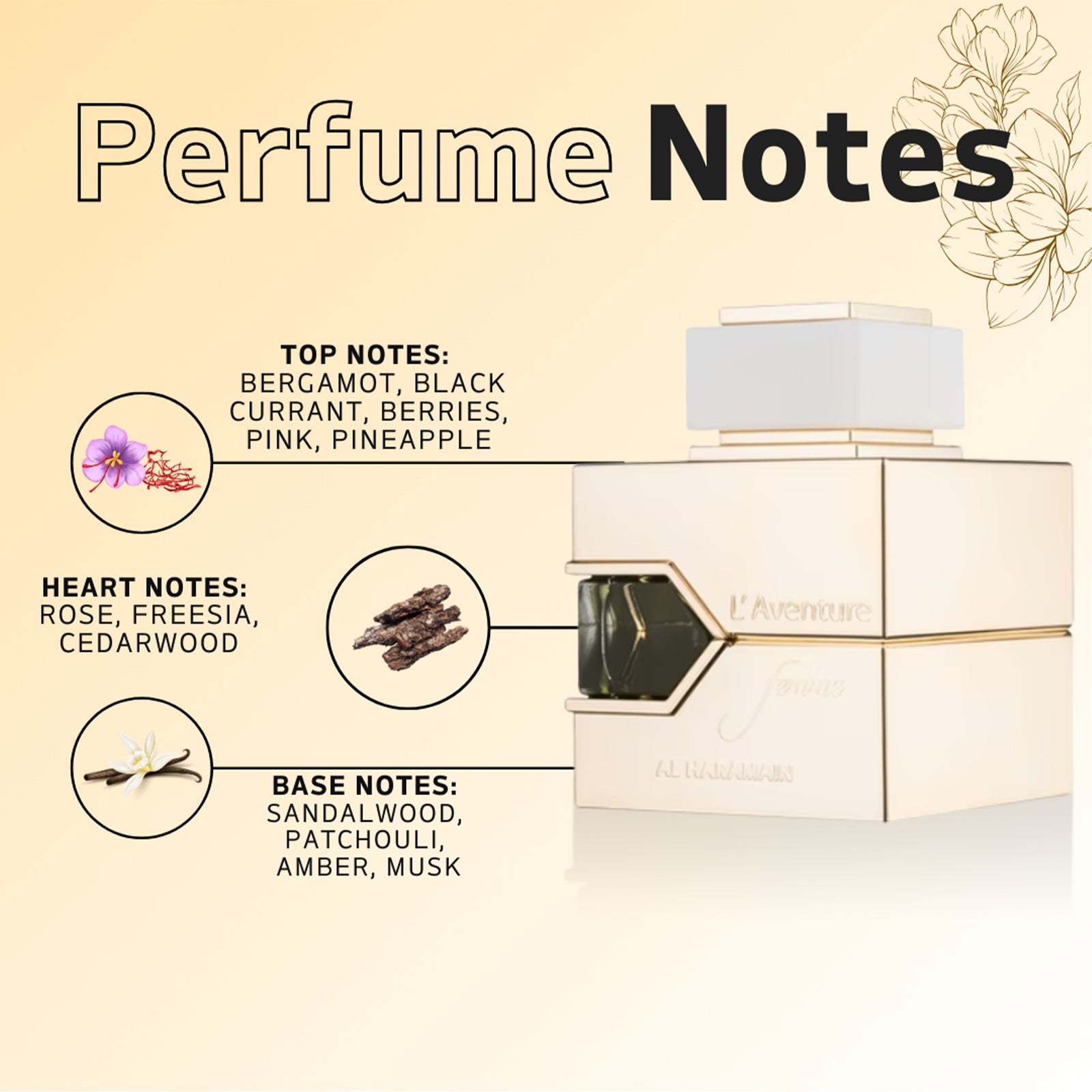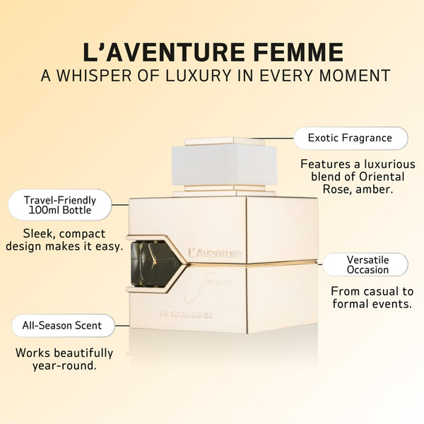 L'Aventure Femme is a captivating floral-fruity perfume crafted for women who embrace grace and femininity. It opens with a sweet, juicy burst of pineapple, blackcurrant, wild berries, and bergamot, creating an enchanting and sophisticated first impression. Designed for both daily wear and special occasions, this fragrance adds charm, elegance, and confidence to your presence. With its long-lasting formula, it stays vibrant from morning to night—perfect for gifting and celebrating special moments.