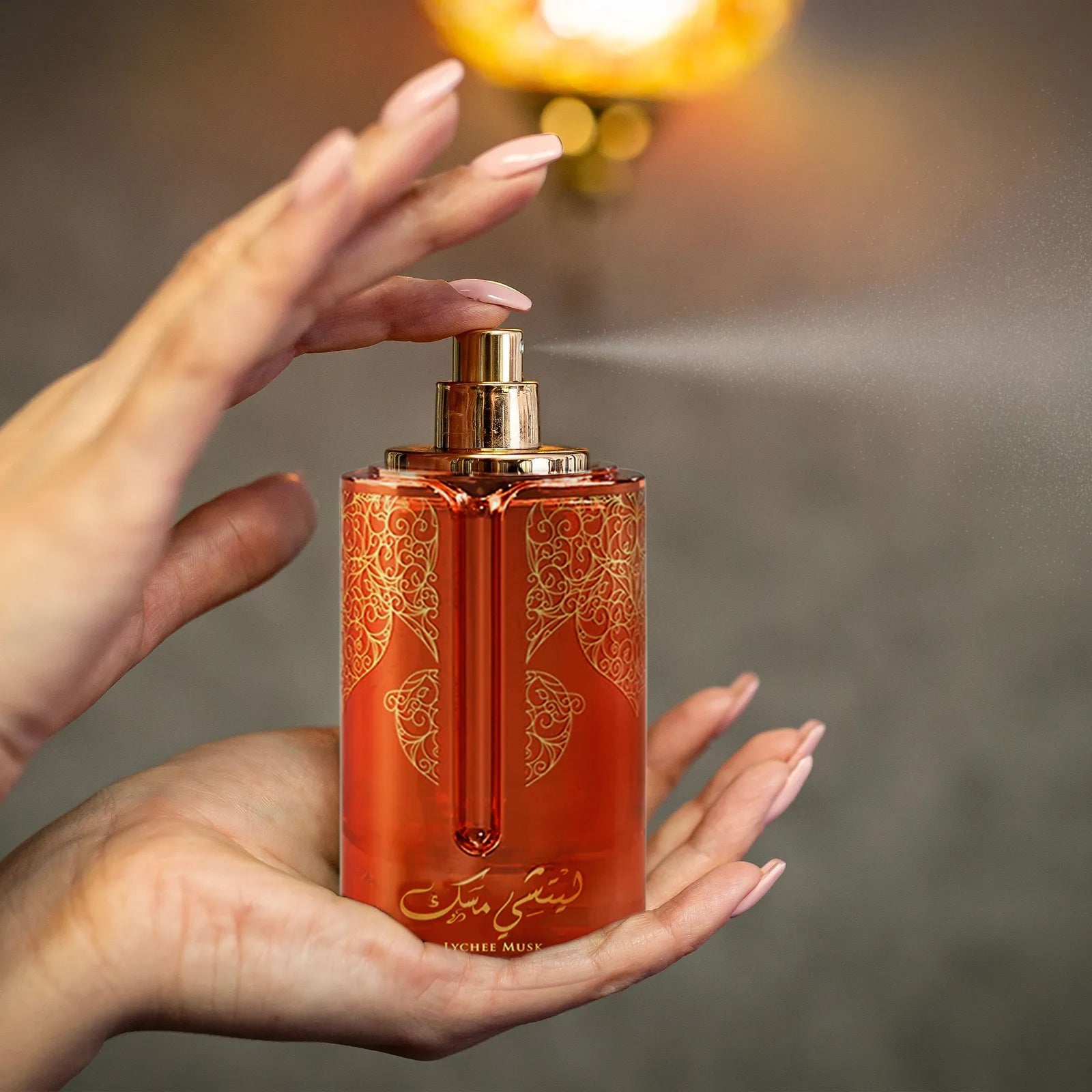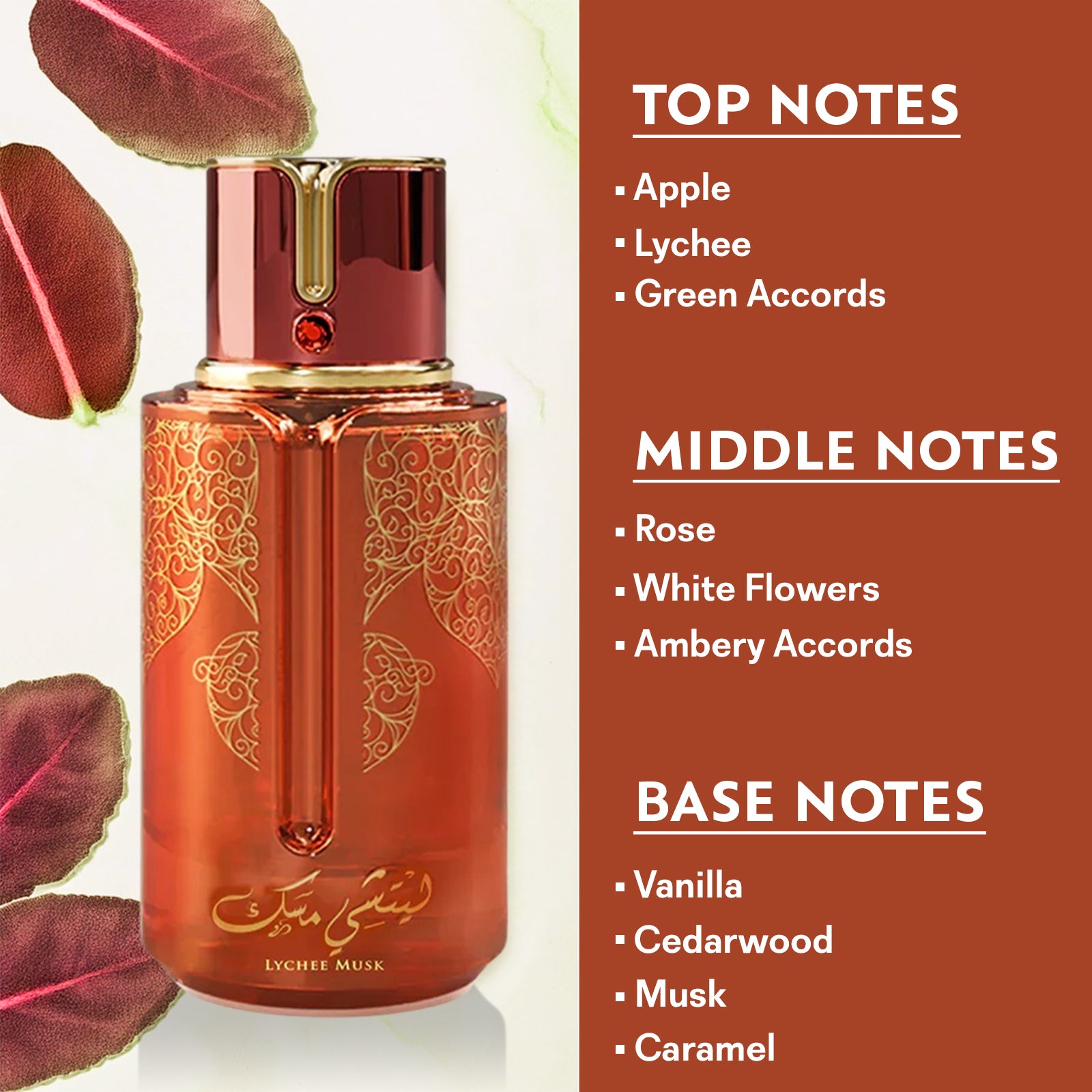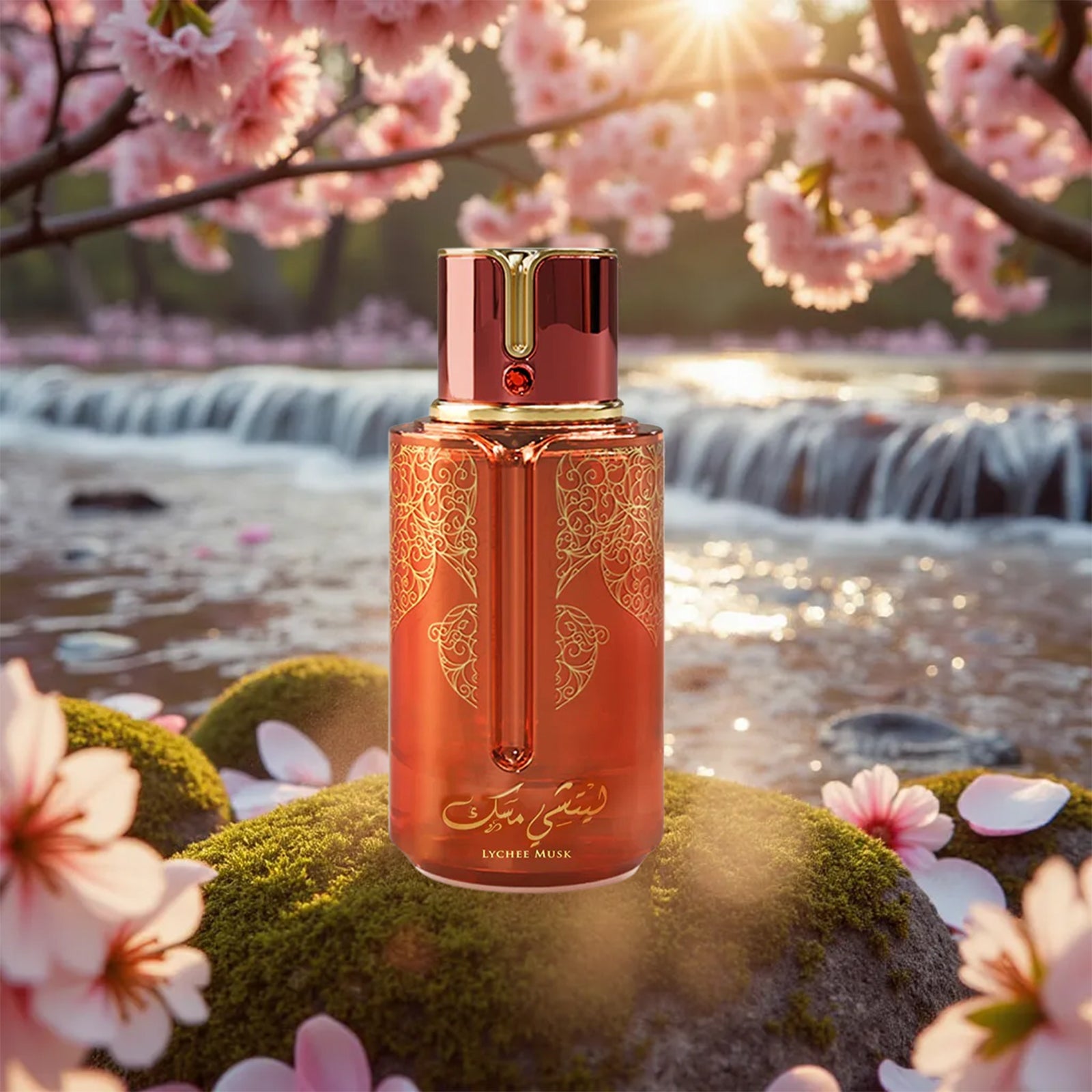 Lychee Musk Eau de Parfum is a fresh and inviting unisex fragrance that blends fruity brightness with soft florals and warm musky sweetness. It opens with crisp apple, juicy lychee, and green notes for a lively first impression. The heart reveals a delicate mix of rose, white florals, and ambery nuances that add depth and charm. The scent settles into a smooth base of musk, vanilla, cedarwood, and caramel, leaving a warm, comforting trail perfect for daily wear or special moments.