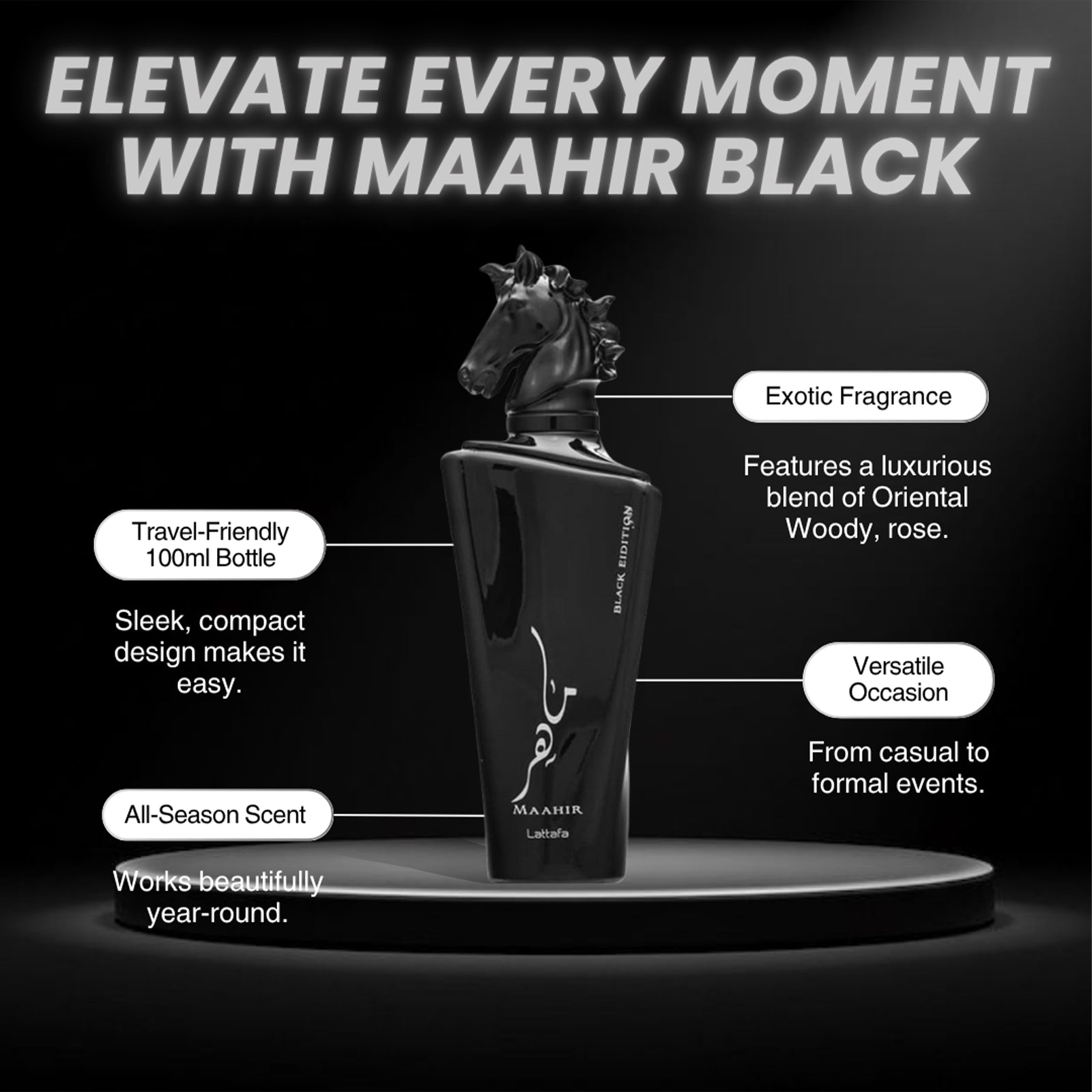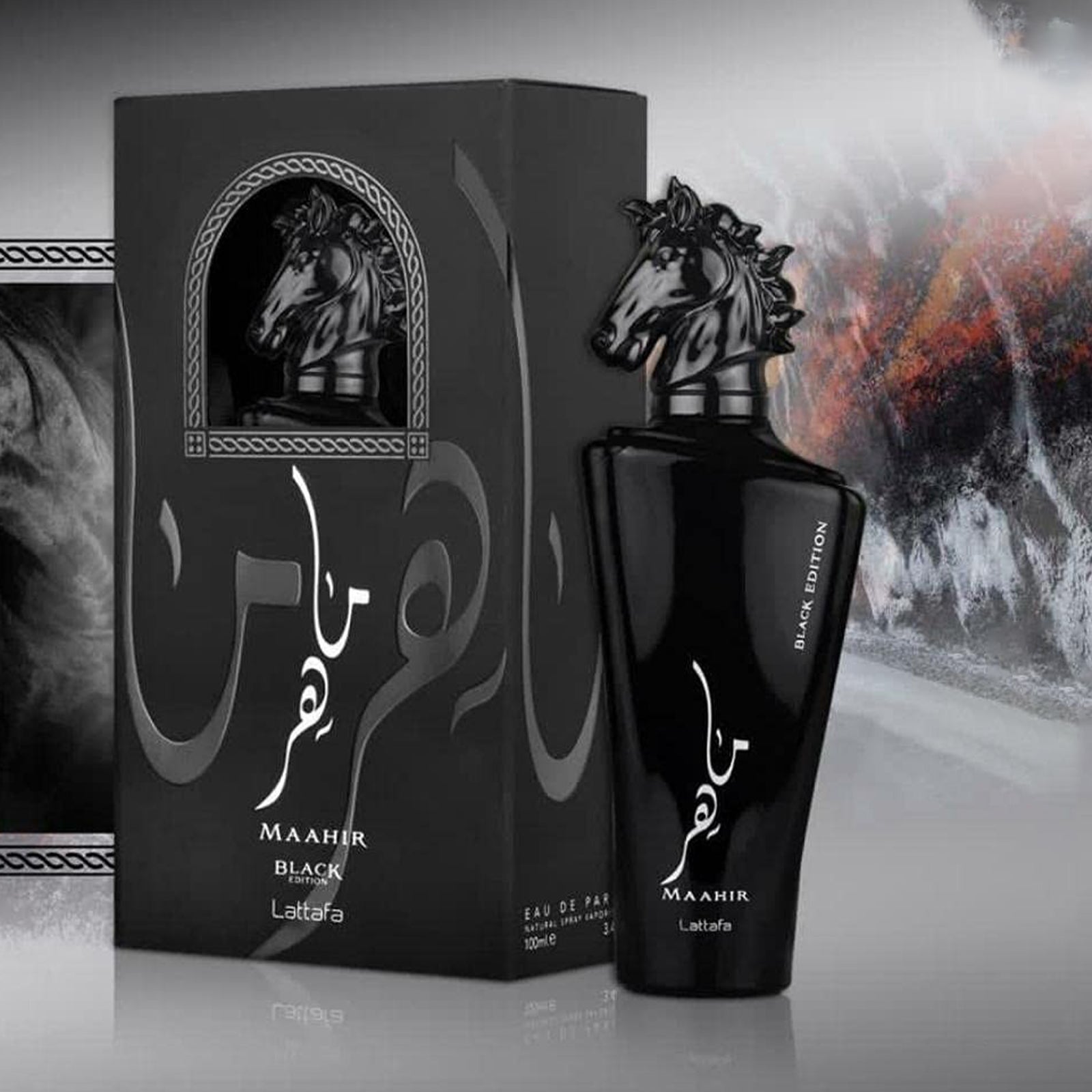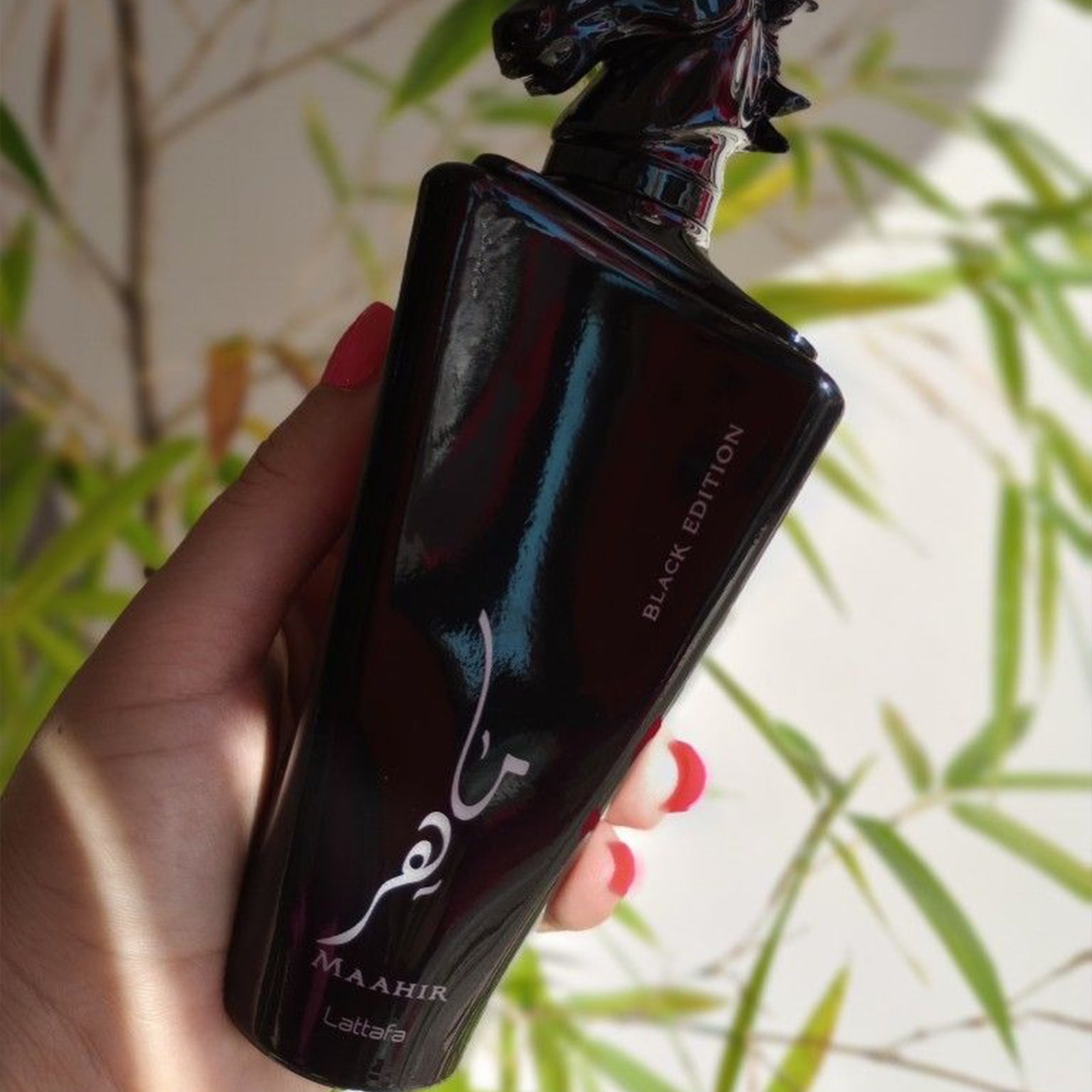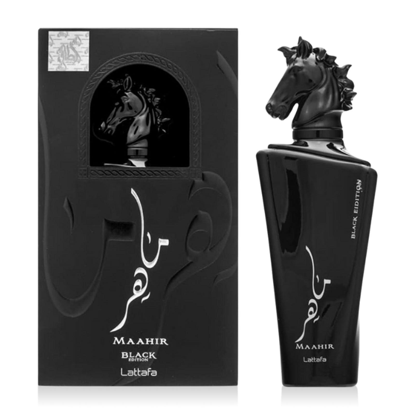 Experience the richness of Maahir Black Edition, a luxurious Eau De Parfum that blends deep woody and amber tones with a refined Arabian touch. Opening with a bold mix of saffron, pepper, and patchouli, it transitions into a warm heart of cedar and pinewood, resting on a sensual base of leather, musk, and deep woody notes. This sophisticated fragrance offers long-lasting elegance, making it the perfect choice for those who appreciate fine perfumery. Beautifully packaged, it’s an ideal gift for any special occasion.