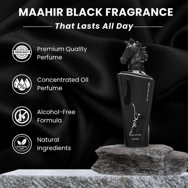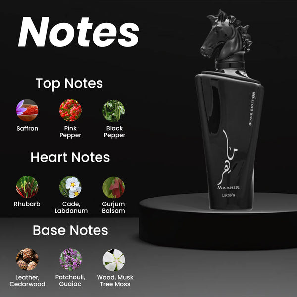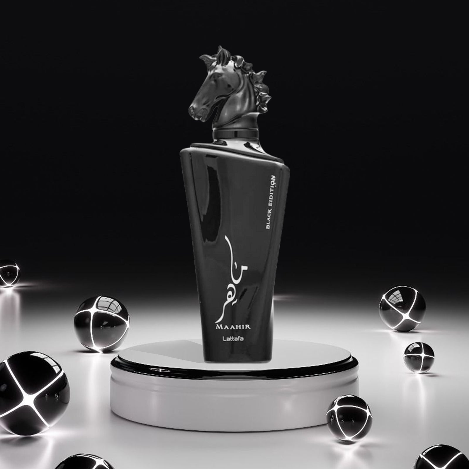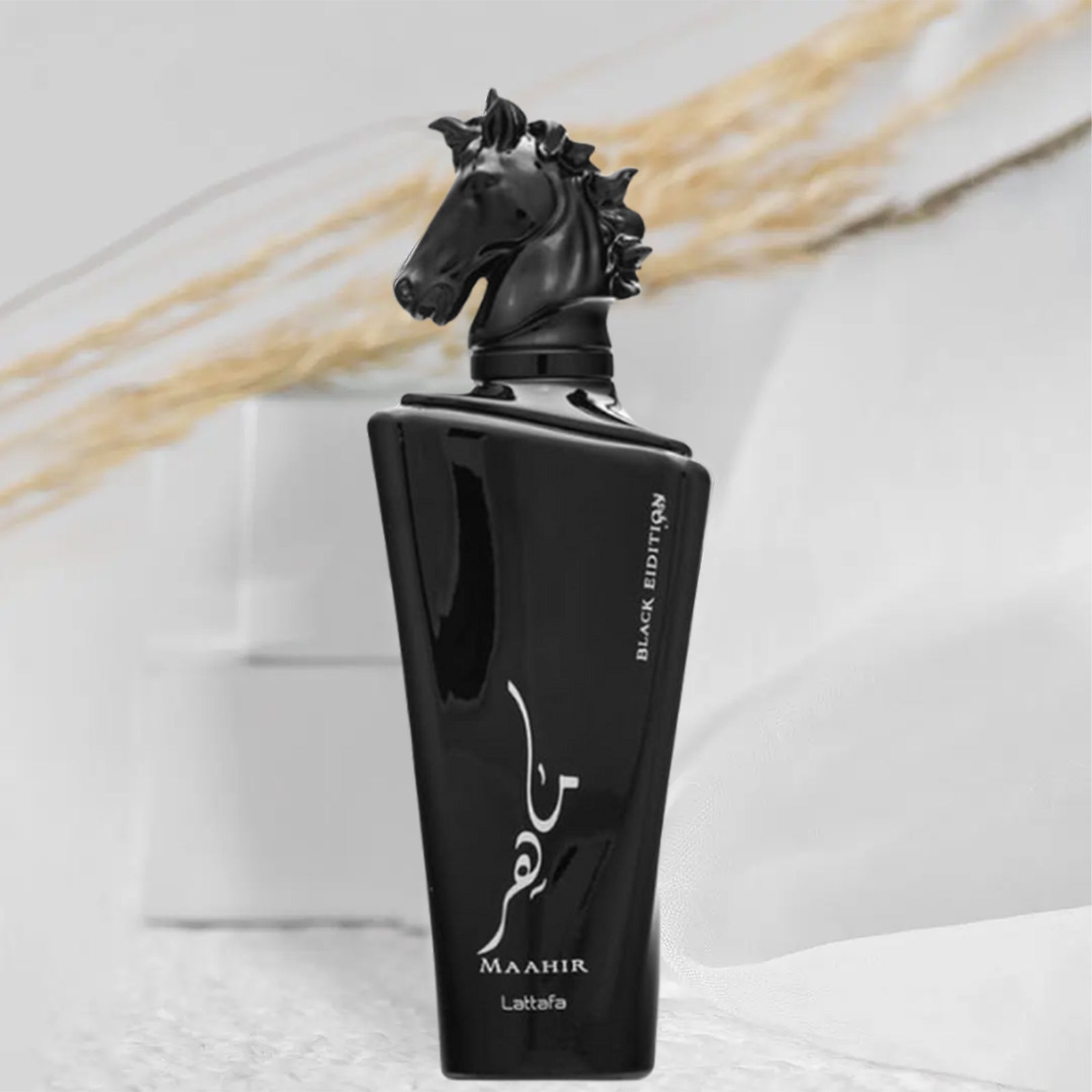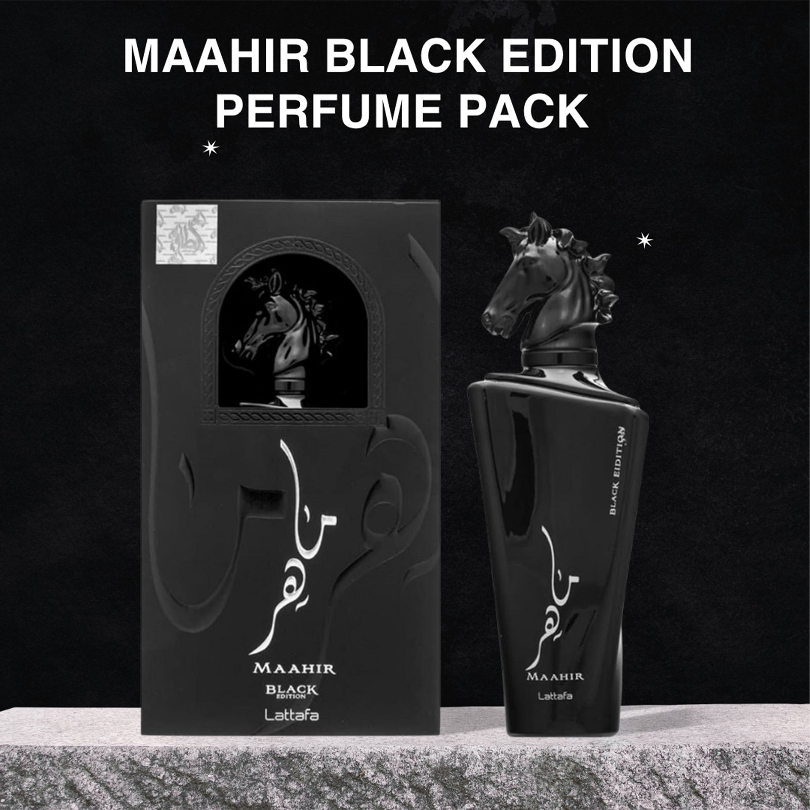 Experience the richness of Maahir Black Edition, a luxurious Eau De Parfum that blends deep woody and amber tones with a refined Arabian touch. Opening with a bold mix of saffron, pepper, and patchouli, it transitions into a warm heart of cedar and pinewood, resting on a sensual base of leather, musk, and deep woody notes. This sophisticated fragrance offers long-lasting elegance, making it the perfect choice for those who appreciate fine perfumery. Beautifully packaged, it’s an ideal gift for any special occasion.