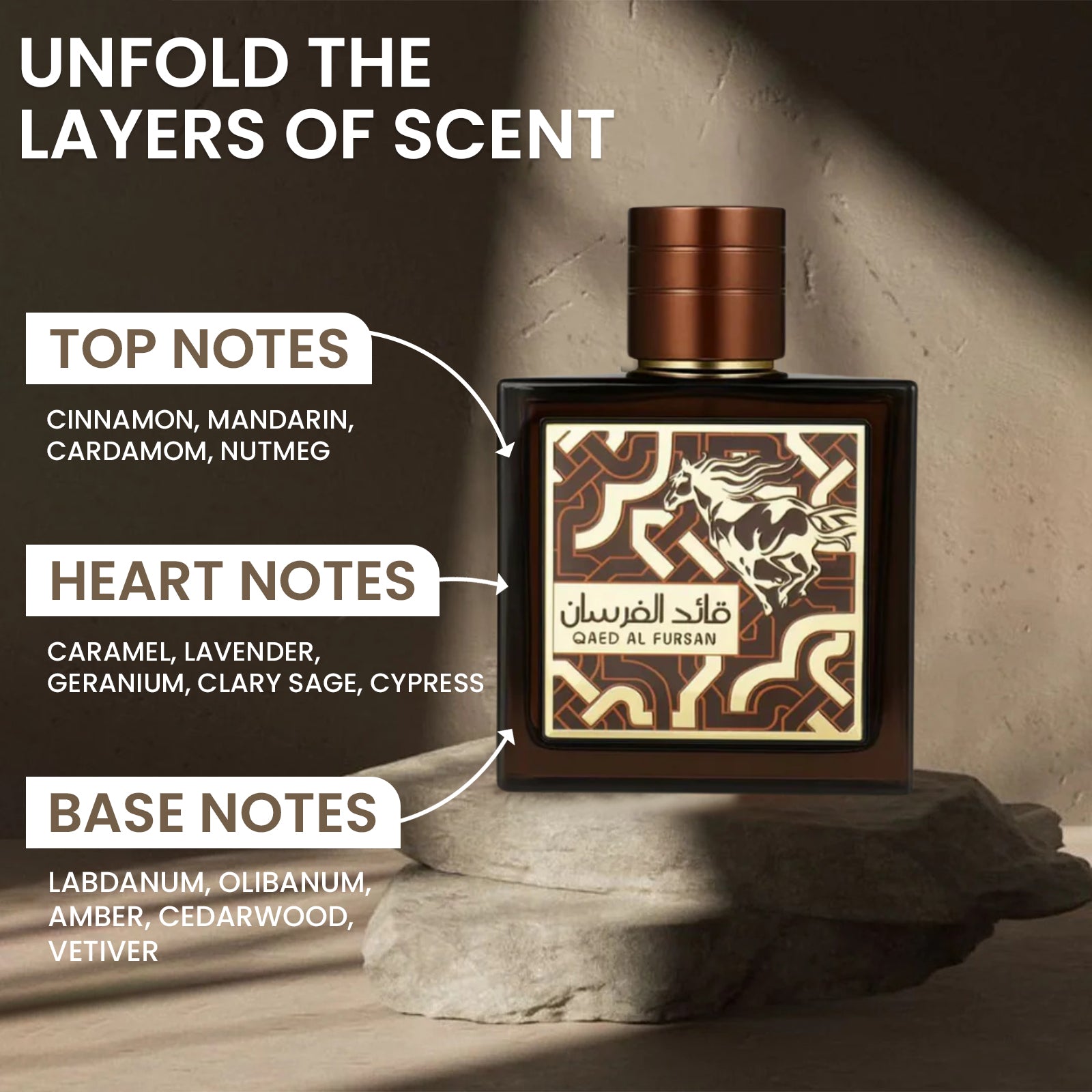 The top notes ignite your senses with the zesty warmth of mandarin, cardamom, and cinnamon, paired with the spice of nutmeg. As it evolves, the heart of lavender, geranium, and caramel brings floral sweetness with herbal depth, enriched by clary sage and cypress for a green twist. The base finishes powerfully with amber, vetiver, and cedarwood, deepened by labdanum and olibanum, creating a smoky, resinous trail that’s both bold and sensual.