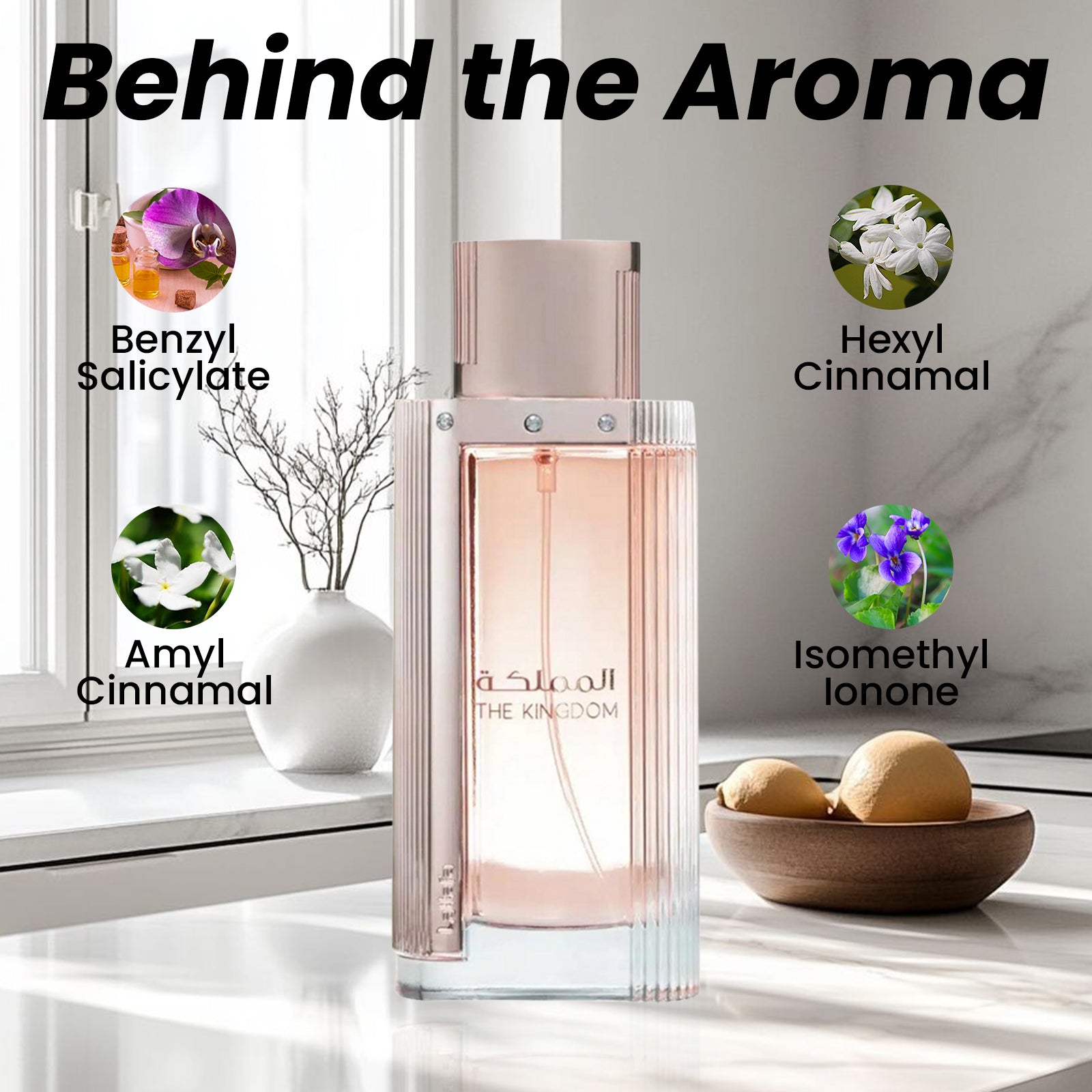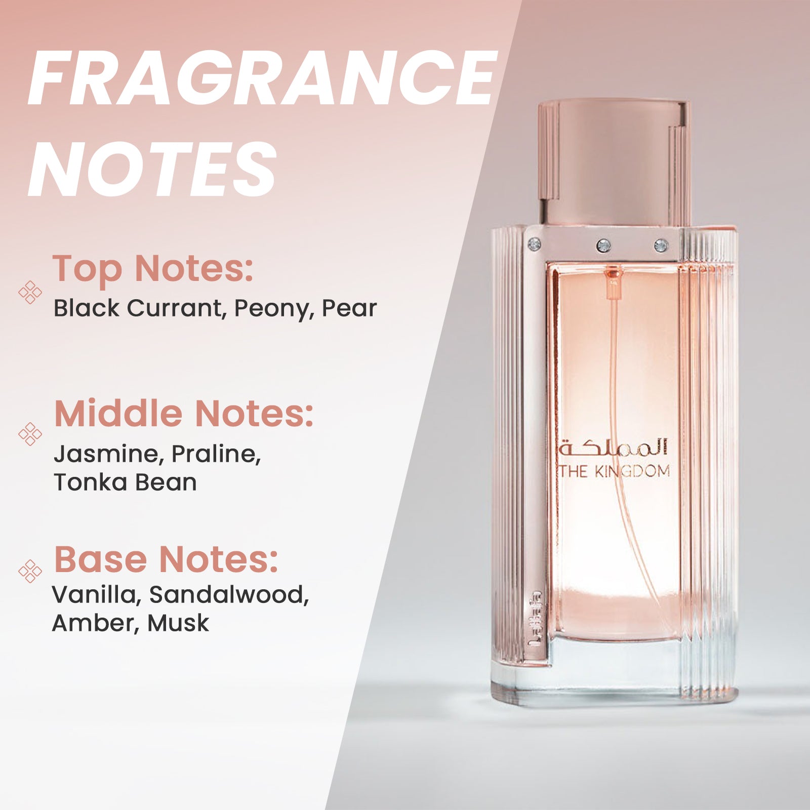 The Kingdom for Women Eau de Parfum is a regal fragrance that captures the essence of elegance, femininity, and modern grace. It opens with a bright and charming blend of black currant, peony, and pear, creating a lively and enchanting aura. The heart of the fragrance reveals a warm floral sweetness, as jasmine pairs with indulgent praline and smooth tonka bean, adding sophistication and depth.