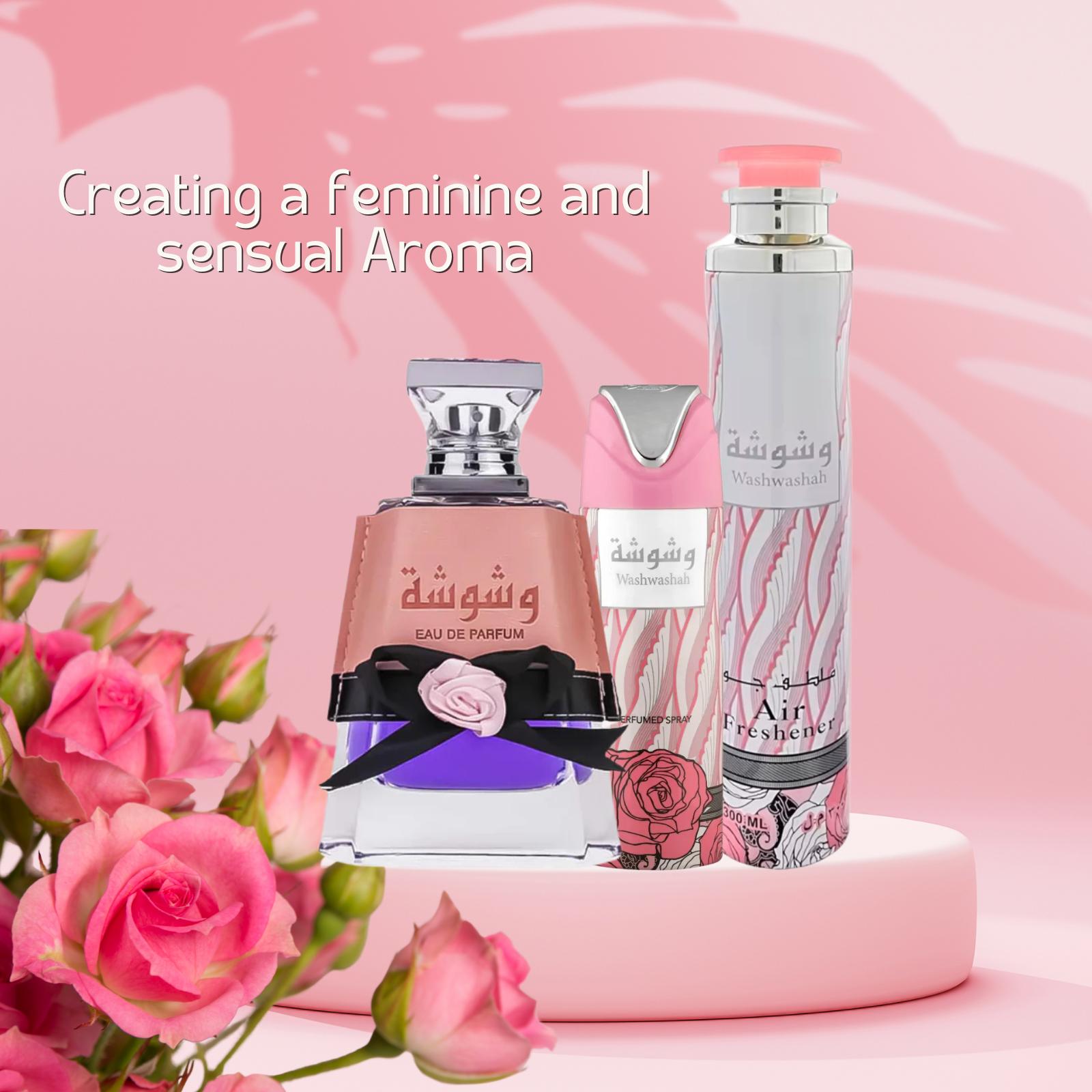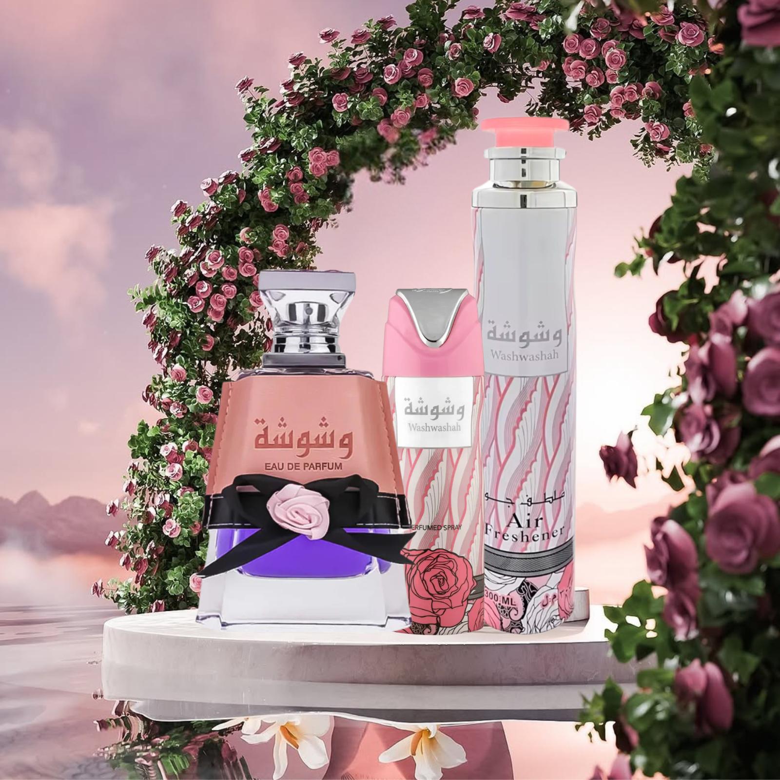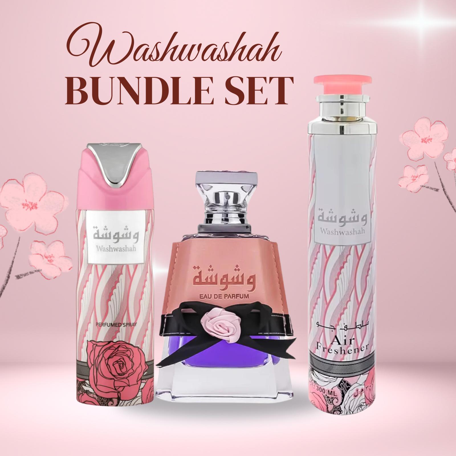 Indulge in the luxurious Washwashah Perfume Bundle, a premium Arabic fragrance set designed for women who appreciate elegance and sophistication. This complete set includes a 100ml Eau de Parfum, 200ml Perfumed Body Spray, and 300ml Air Freshener, creating a harmonious and long-lasting fragrance experience. Infused with a blend of sweet, floral, amber, vanilla, and fruity notes, this set offers an unforgettable scent that lasts throughout the day. Perfect for Anniversary, Birthday, or Easter celebrations, this elegant bundle is an ideal gift that brings timeless beauty to every occasion.